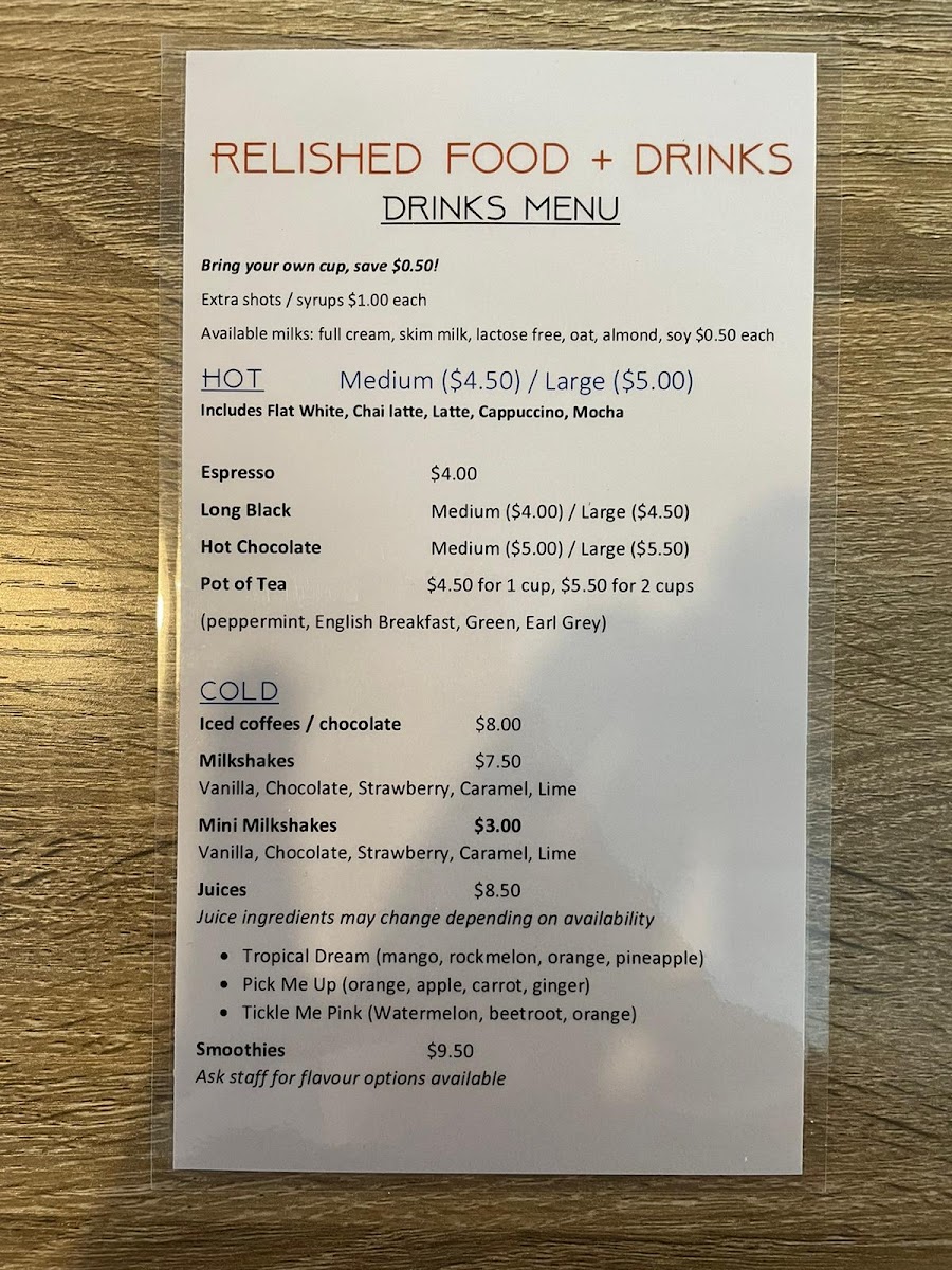 Relished also excels in the beverages department. Quench your thirst with a refreshing Iced Coffee (A$8.00) or indulge in a silky Milkshake (A$7.50). The coffee, made from locally sourced beans, is as rich as the friendly conversations you’ll hear around you, adding to the inviting theater of this vibrant café.
